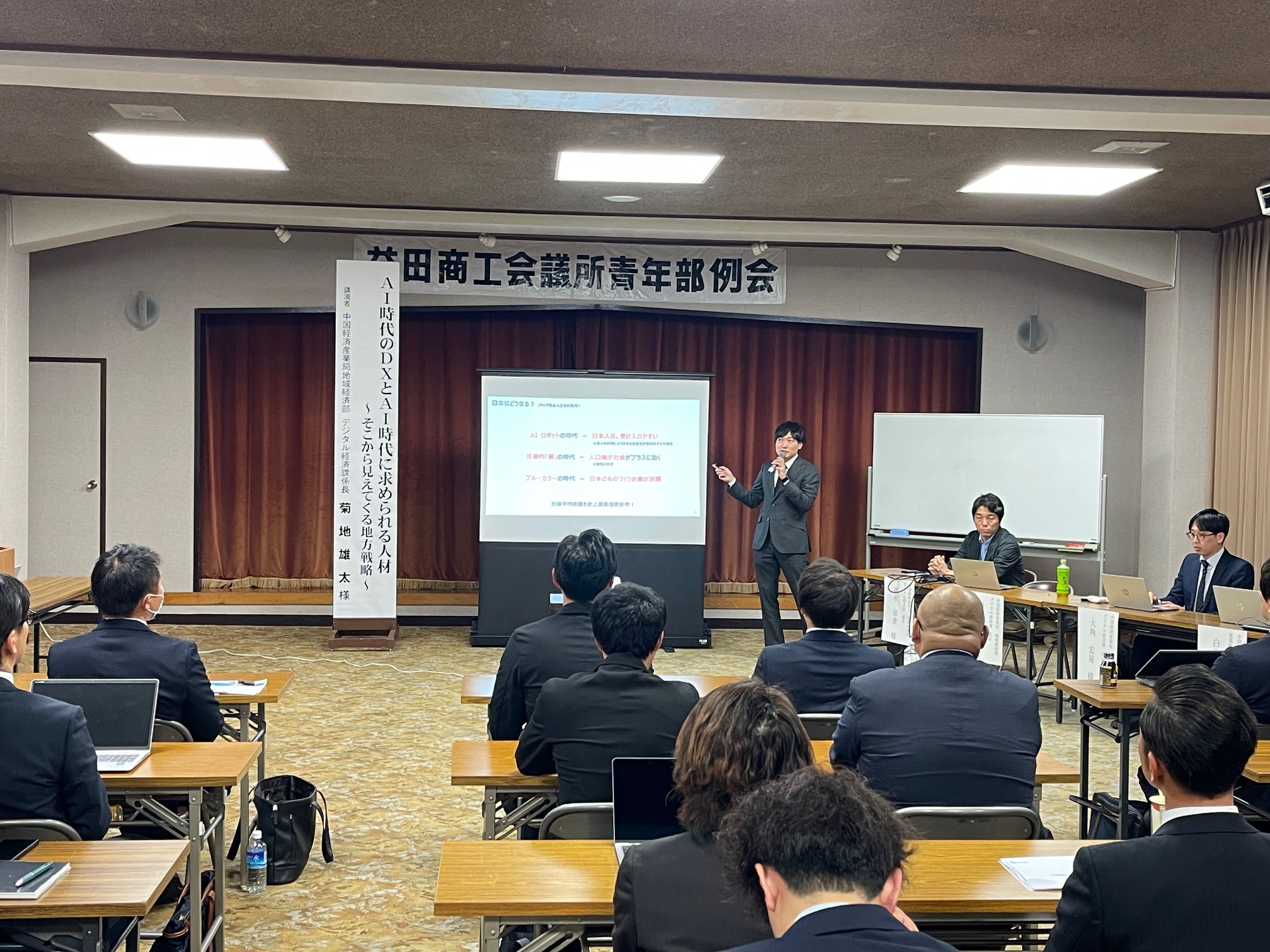 去る11月17日(月)、益田商工会議所3階大会議室において令和7年度11月例会を開催しました。本例会では、中国経済産業局の方々をお招きし、「AI時代のDXとAI時代に求められる人材 ~そこから見えてくる地方戦略~」と題した基調講演をはじめ、DX施策の説明や補助金に関するご講演をいただきました。